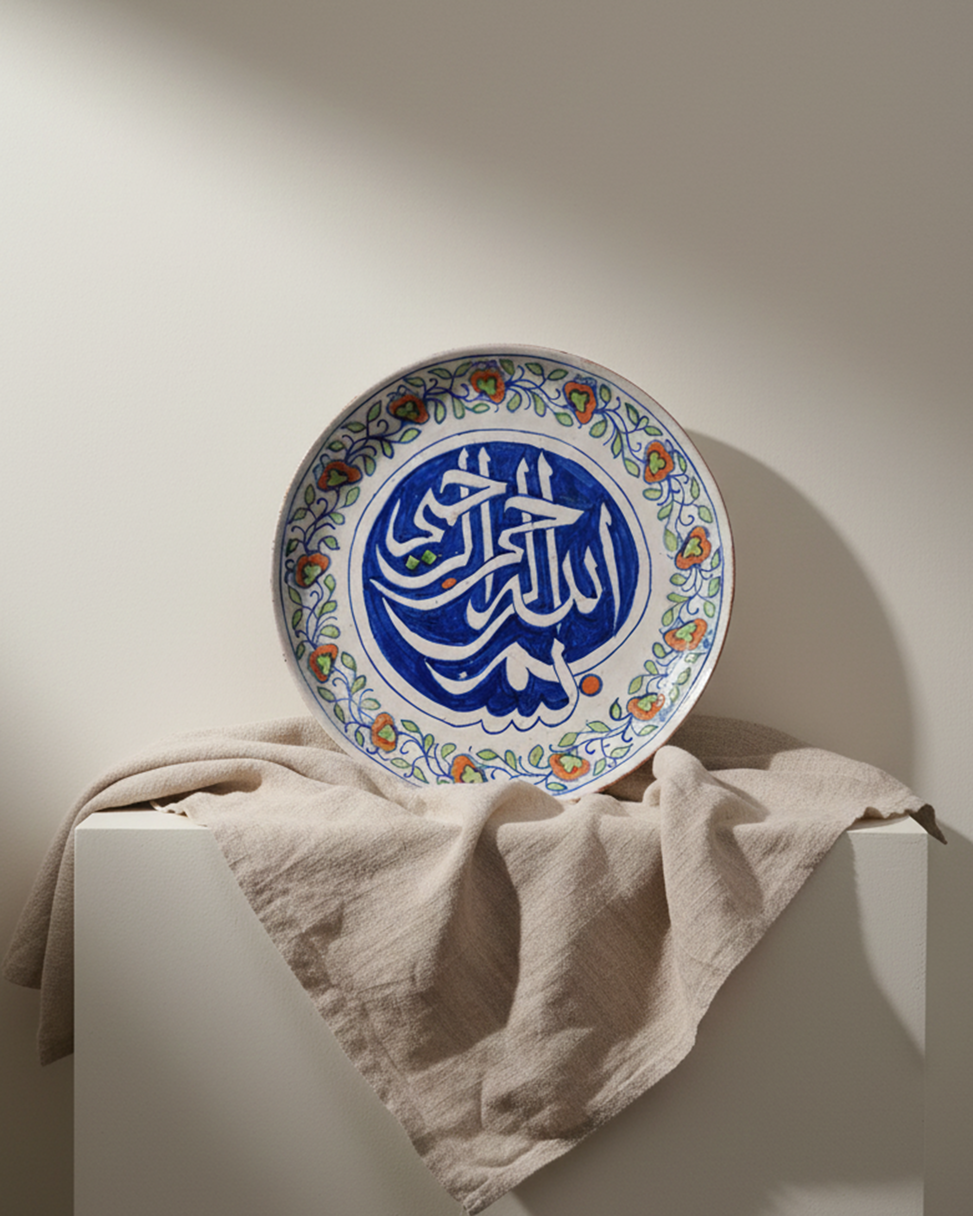 This plate is a deeply meaningful and honest piece of hand-done craft. The bold, blue calligraphy of 'Bismillah' at the center gives the plate a peaceful, grounding presence. It makes a lasting gift for any occasion that calls for peace and remembrance.