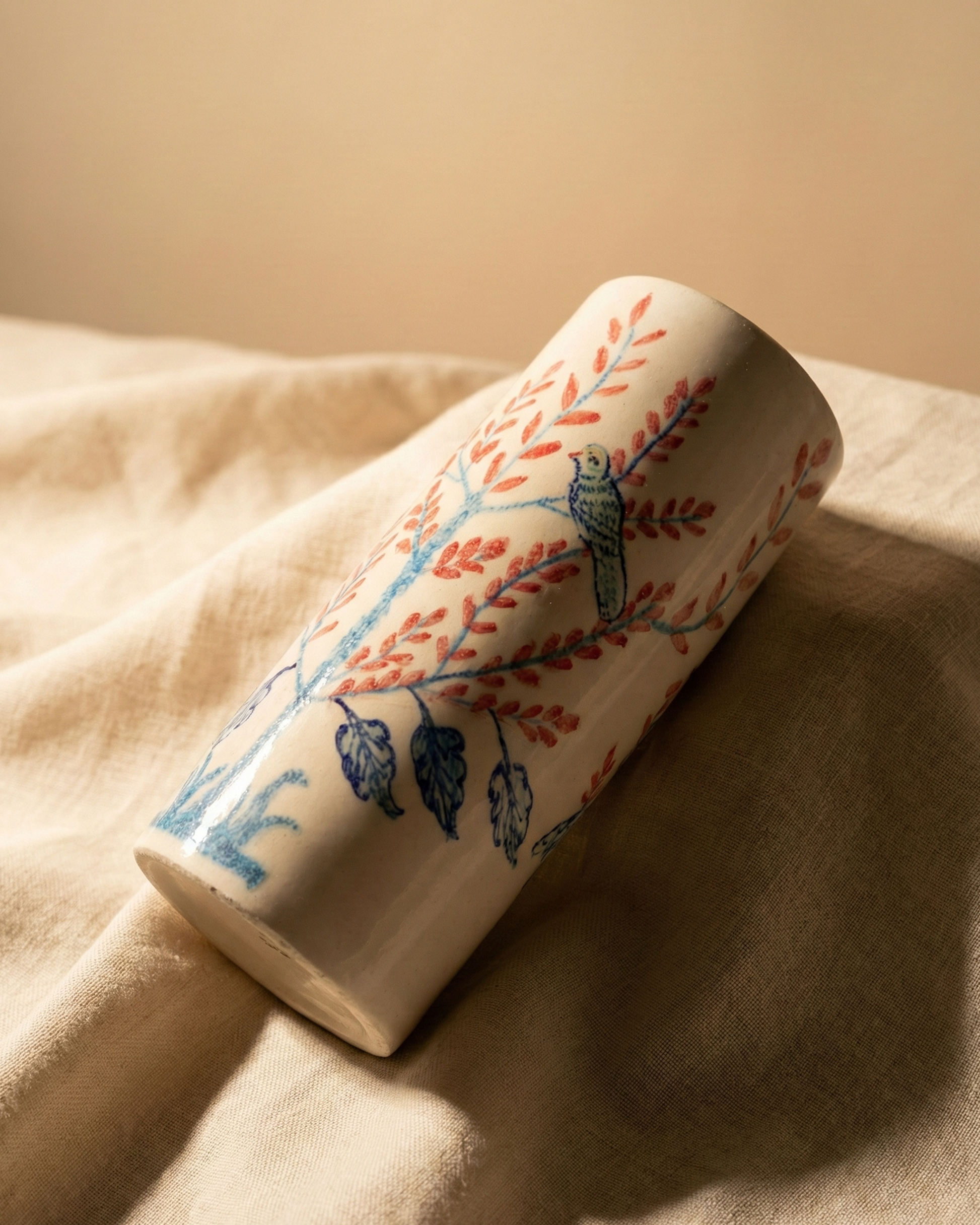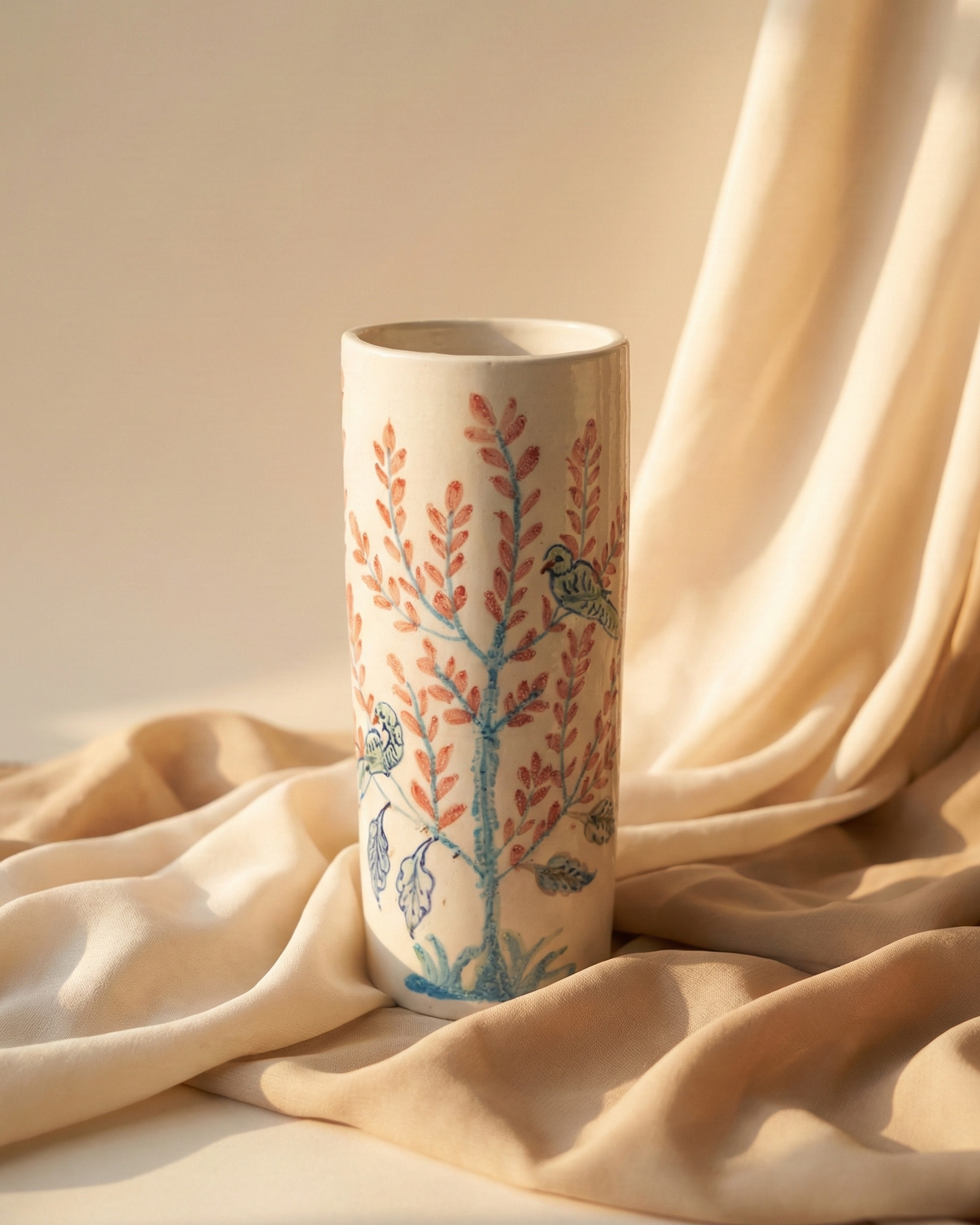 This tall, cylindrical ceramic vase features a hand-painted "Tree of Life" motif with delicate pink leaves and perched blue birds. Its slender silhouette and soft white glaze create an elegant, nature-inspired focal point for any room.